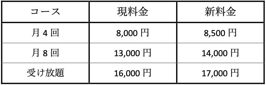 【2022年12月〜】 レッスン料金改定のお知らせ お知らせ 2022.10.01 平素より大変お世話になっております。 大変恐縮ではございますが、2022年12月分お月謝よりコース料金を変更させていただくこととなりました。これからもより良いレッスンを提供できるよう努めてまいりますので、何卒ご理解賜りますようお願い申し上げます。 【大人グループレッスン】 【キッズグループレッスン】